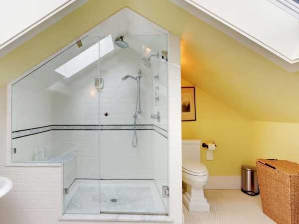 - Душевую кабинку размещают подальше от скоса крыши. Унитаз и раковину размещают таким образом, чтобы избежать возможного травмирования о потолочные конструкции.