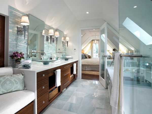 В основном помещения под крышей используются для спальни, а не для помещения санузла. Но самый идеальный вариант — разместить рядом со спальней ванную комнату. Зачем спускаться на нижний этаж для посещения туалета, если он может находится рядом?