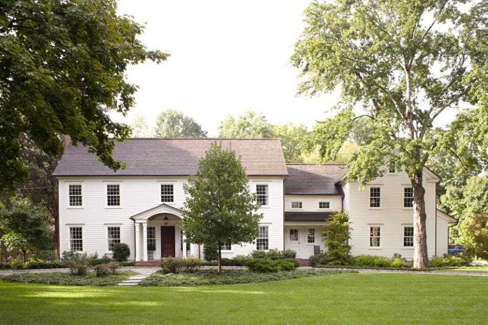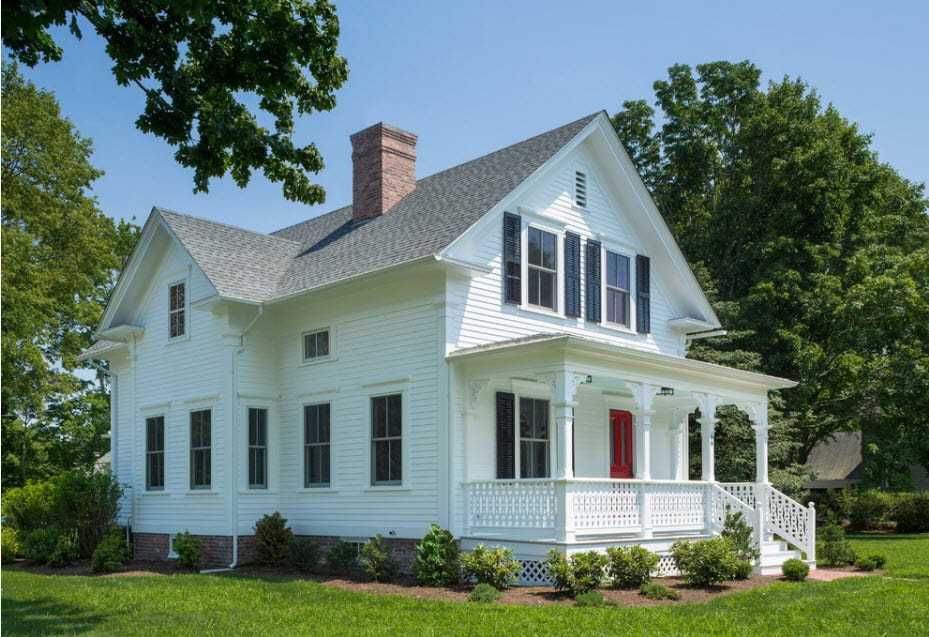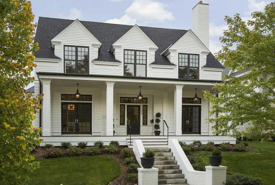 17. Несложный по архитектуре двухэтажный дом выглядит на фото очень нарядным и легким, благодаря белому цвету фасада и открытой террасе.