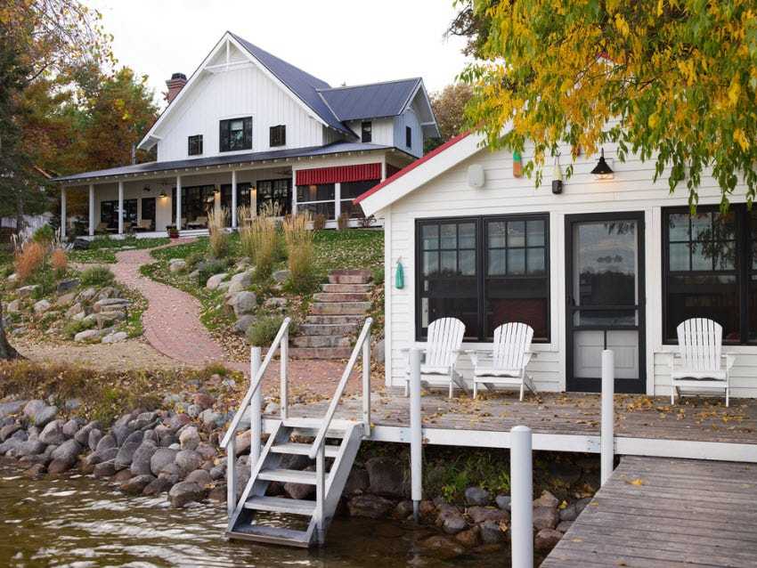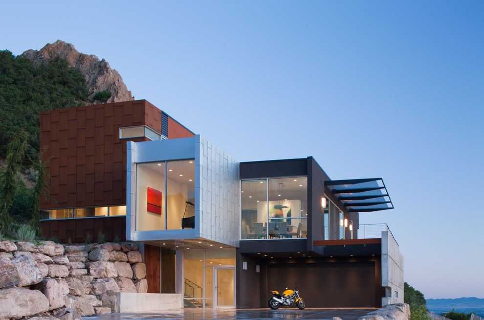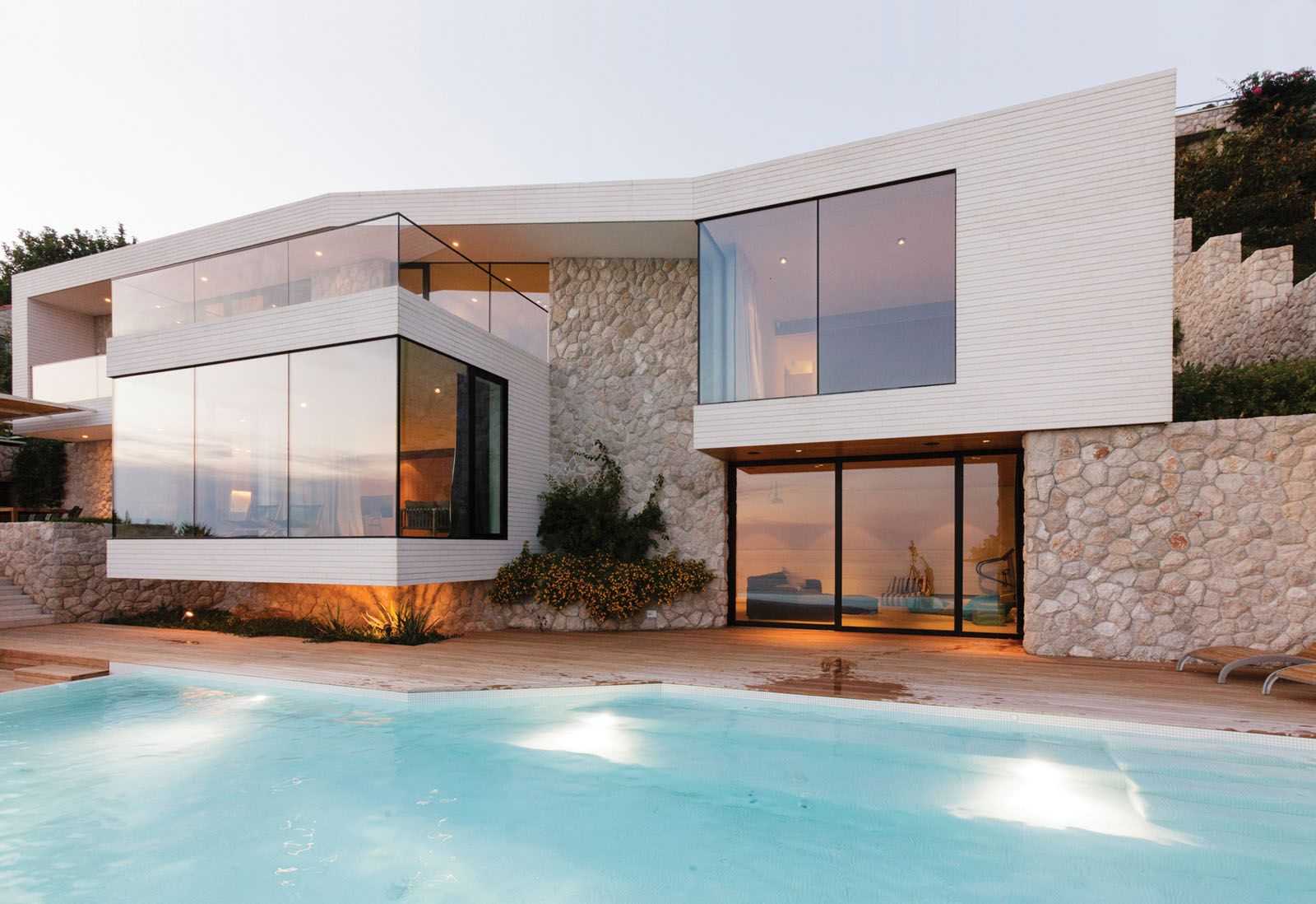 13. В отделке первого этажа — традиционный материал (облицовочный камень), и поэтому неожиданно удивляет обилие стеклянных стен на втором уровне.