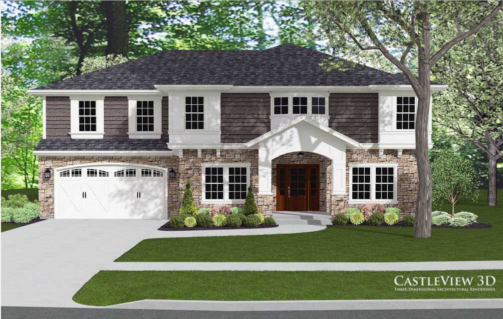 Интересный пример проекта двухэтажного дома представлен на следующем фото. Главная его особенность – функциональный гараж для двух машин, крыша которого используется как просторная терраса (выход на нее спланирован со второго этажа). Очень эстетично и со вкусом устроен внешний фасад дома, где отделка гаража и второго этажа имитирует брус – эффектный контраст, способствующий гармоничному восприятию экстерьера постройки в целом.