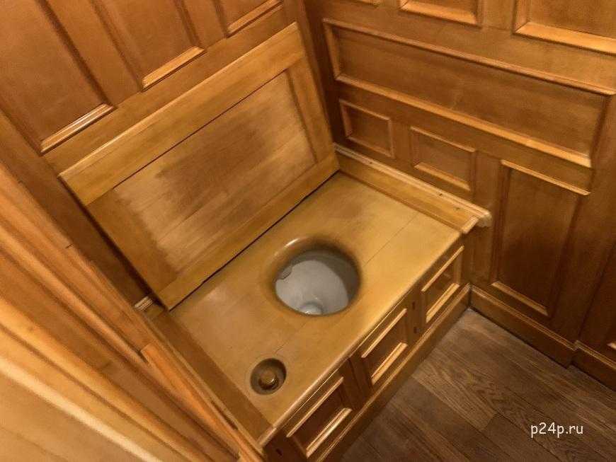 Там же находится ванная княгини – небольшая комната с овальным окном, выходящим во внутренний двор. Украшена цветной керамической плиткой и лепниной. Её нам не показали. А вот туалет княгини можно было посмотреть. Выглядит как современный унитаз и говорят до сих пор в рабочем состоянии.