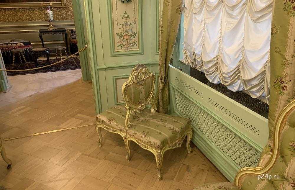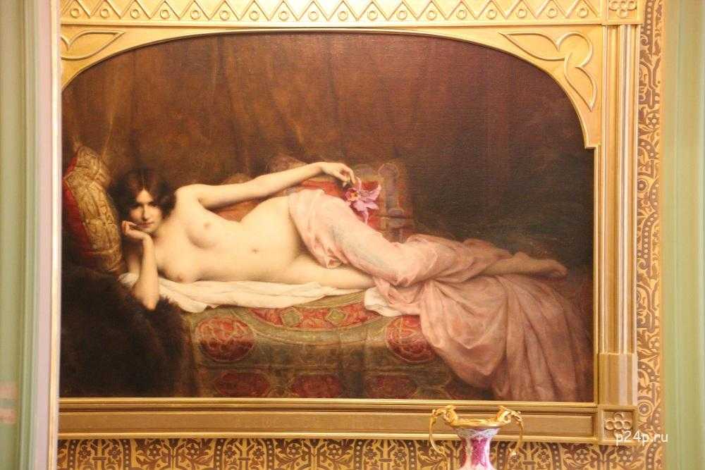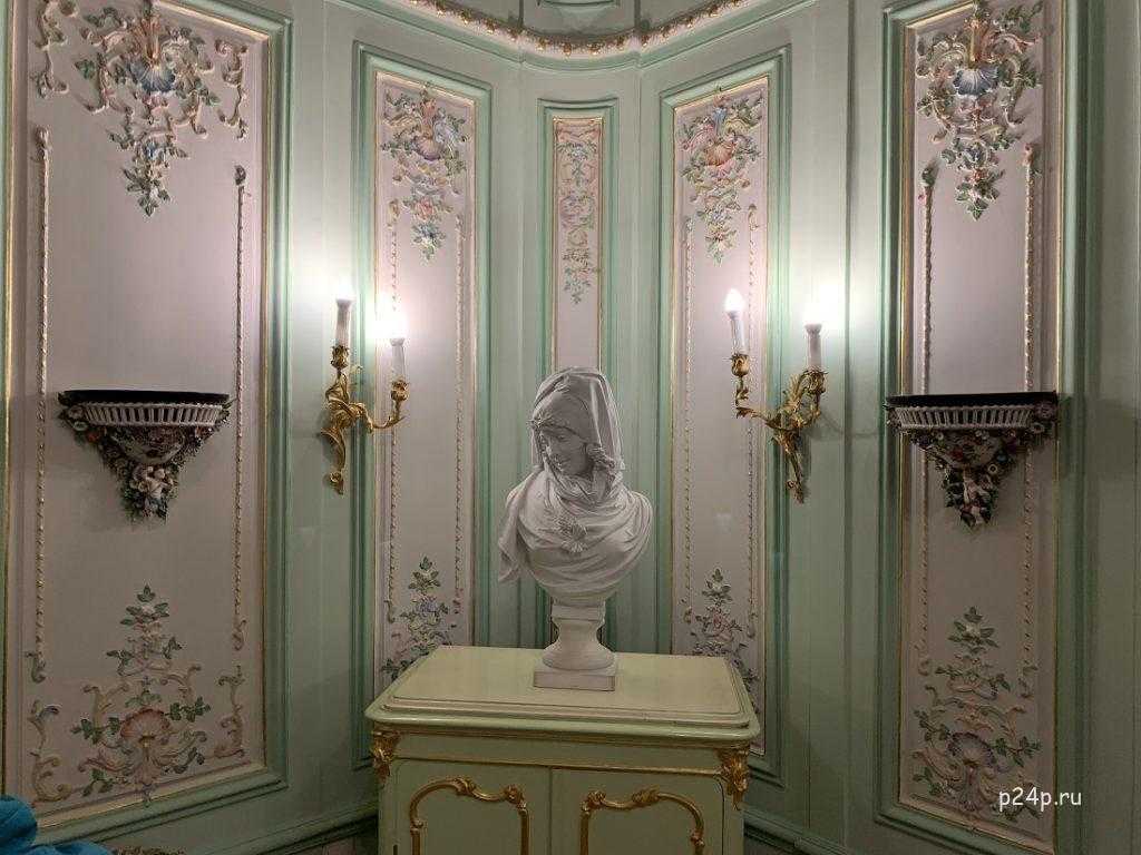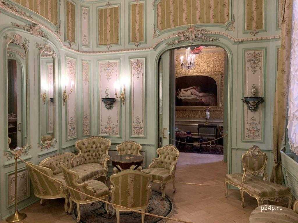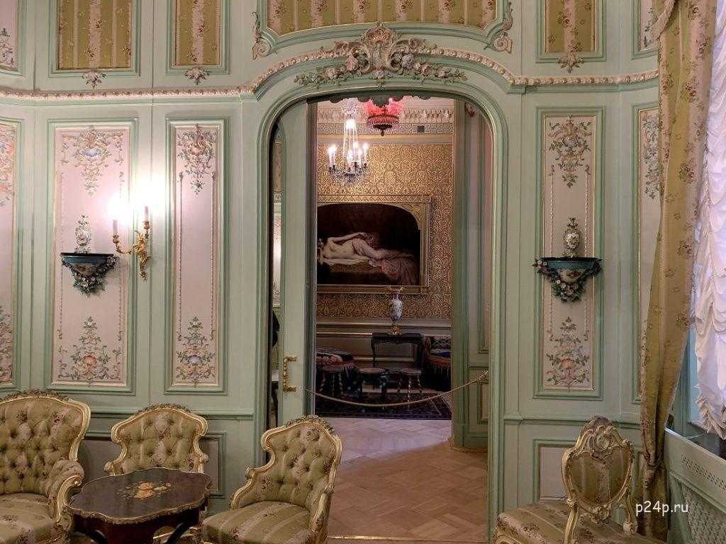 Персидский будуар находится в едином пространстве с Фарфоровым будуаром, в глубине комнаты. Нам разрешили посмотреть на него только издалека. Вдалеке видна пикантная картина.