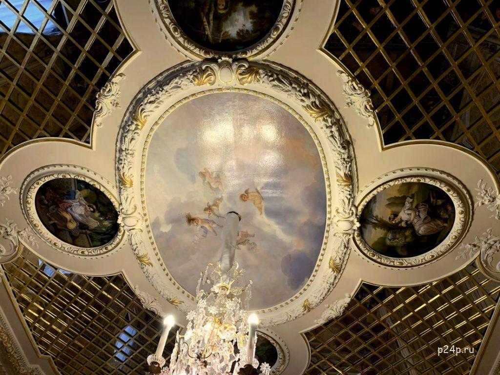 На стене портрет Зинаиды Юсуповой работы Валентина Серова. Позировала она в Белой гостинойПлафон в Белой гостиной