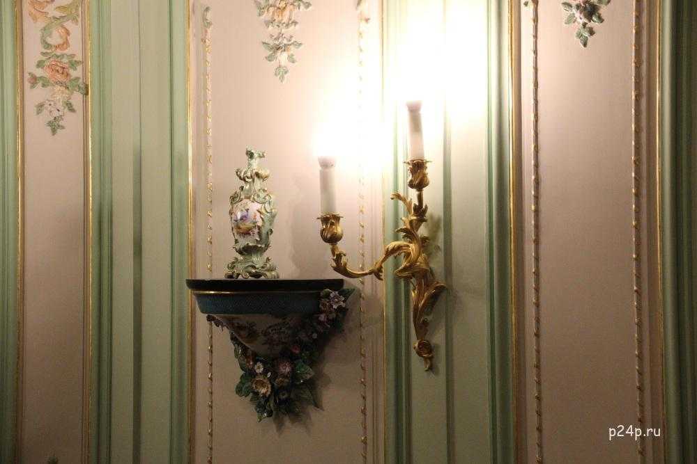 Воздушности комнате добавляет и зеркальный потолок. Люстра будуара, изготовленная в России в начале XX века, напоминает цветочную корзину. Она подлинная. Роспись потолка имитирует отделку под фарфор.