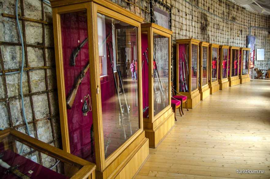 В галереи второго этажа, примыкающей к Кухонному каре расположилась выставка оружия Гатчинского дворца. Стены галереи реставрированы не до конца.
