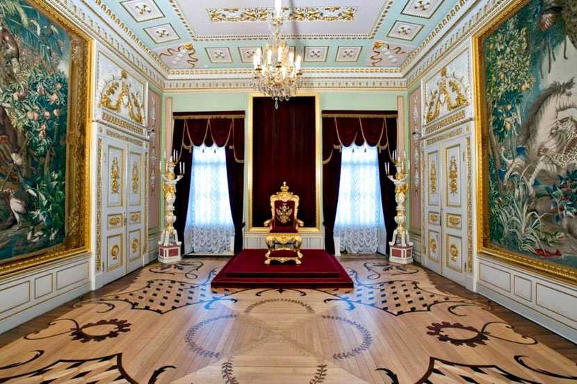 Паркет из ценных пород дерева. В центре паркетного покрытия переплетенные венки, окруженные фигурной сеткой из ромбов. Резное золоченое тронное кресло – работа придворного мастера Мейера.