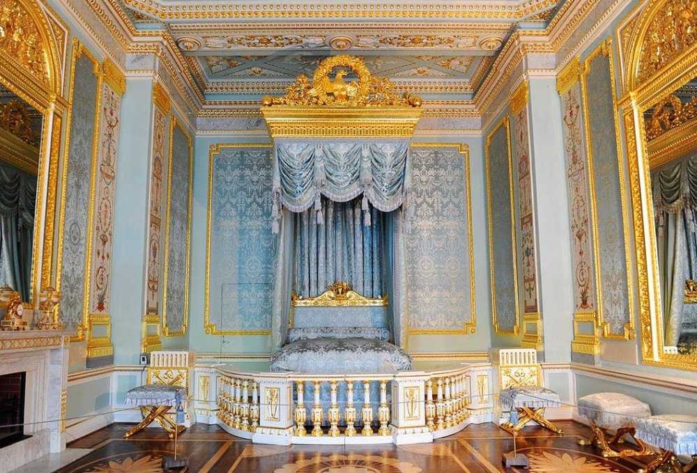 Резная кровать огромных размеров с балдахином над ней соседствует с синими фарфоровыми вазами в золоченой бронзе и сочетается с декором дверных полотен. В алькове – потайная дверь на темную винтовую лестницу, ведущую в покои императора.