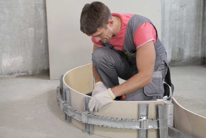 Под фигуры на стенах из гипсокартона, имеющие плавные изгибы, металлопрофиль «гнется» (при помощи «болгарки» делаются надрезы или выпиливаются сегменты прямоугольной формы). Все радиусные участки укрепляются металлическими перемычками.