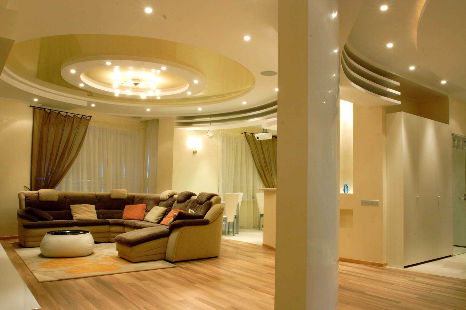 Вторым важным этапом при планировании возведения двухуровневого потолка является установка светильников. Под такой конструкцией очень легко спрятать все коммуникации, но схему расположения осветительных приборов желательно продумать заранее. Это поможет сделать освещение в помещении оптимальным. При таком подходе можно удобно зонировать пространство в больших комнатах.