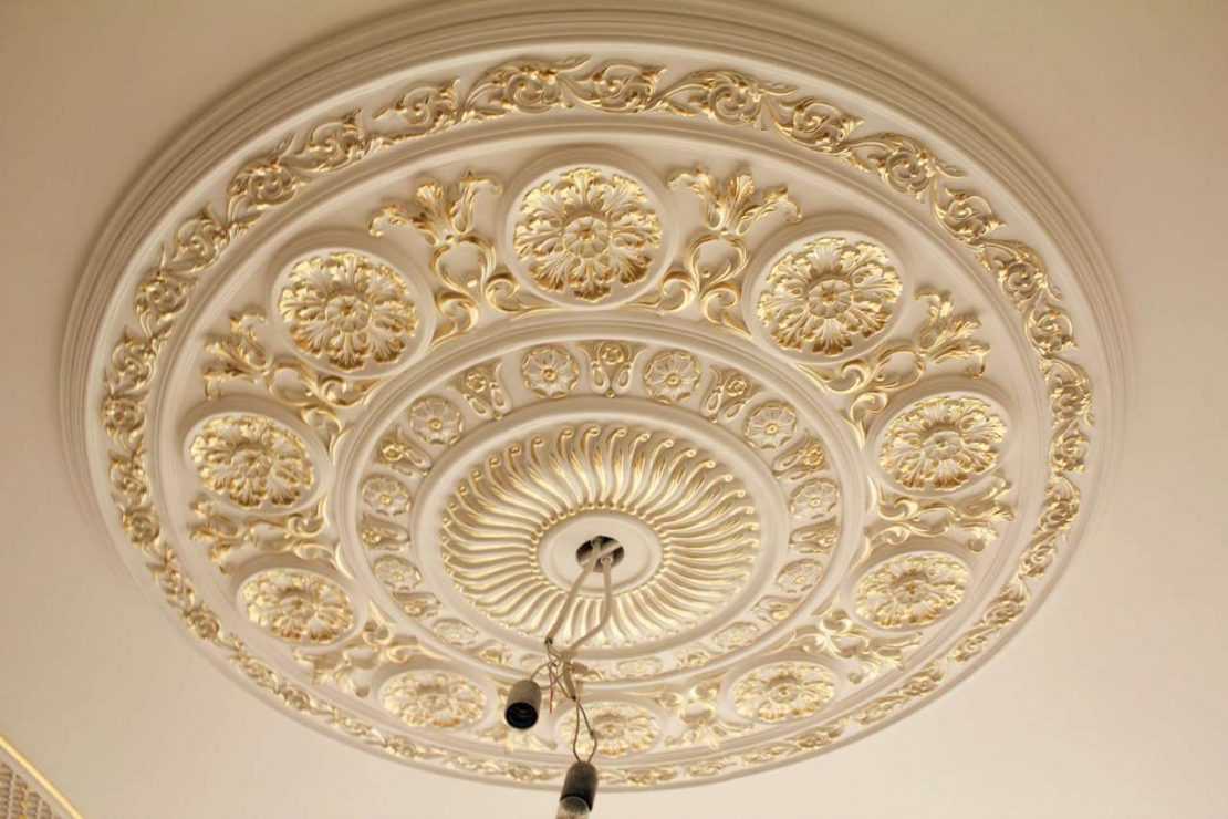 - Гипсовые. Гипс имеет множество достоинств и является экологически чистым материалом. С его помощью можно создавать сложные элементы высокого качества и мельчайшие узоры лепнины, тем самым придавая потолку неповторимый вид.