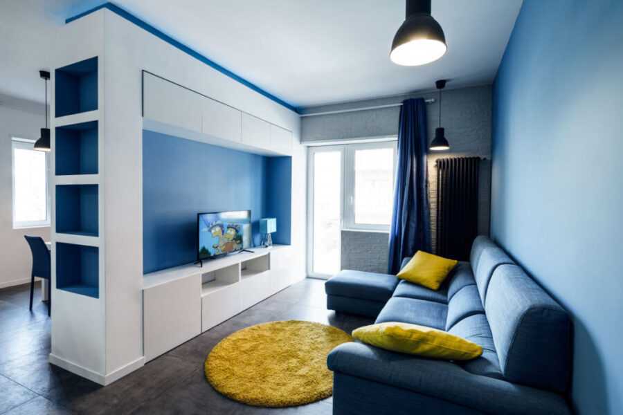 - Васильковый. Комбинирование с белым станет эффектным решением, подходящим для украшения комнаты в современном стиле.