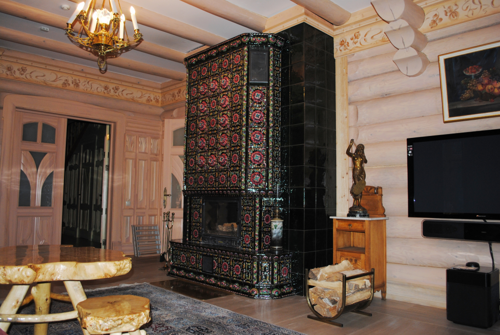 - Русский терем — яркий стиль, как в иллюстрациях к детским сказкам. Печь для него должна быть яркой, с оригинальной резьбой. Для ее оформления используют пестрые изразцы.