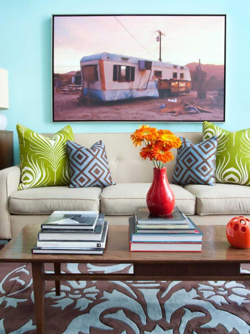 Колор не должен быть ни темным, ни дерзким, чтобы сконцентрировать на себе внимание. Даже если вам приглянулся бледный оттенок бирюзового цвета, он станет необычным и интригующим акцентом вашей гостиной в содружестве с тонами-помощниками