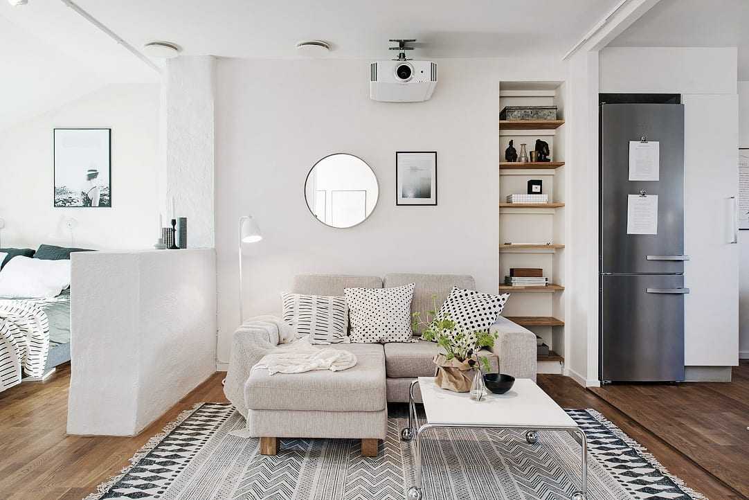 Среди неординарных решений – совмещение гостиной в скандинавском стиле с личным пространством – спальня может стать частью большого свободного пространства. Такое объединение нуждается в зонировании даже больше, чем при слиянии , ведь место для сна должно быть защищено.