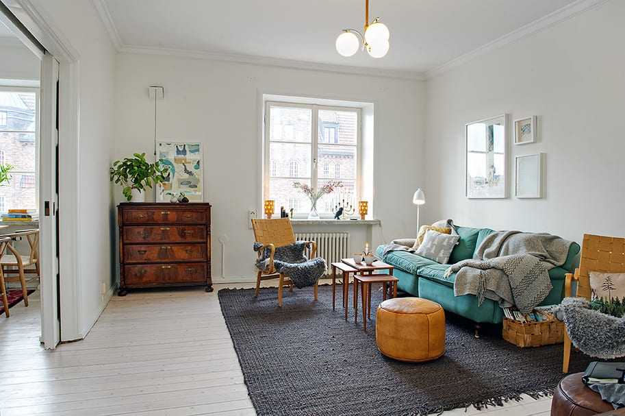 Дизайн гостиной в скандинавском стиле требует соблюдения простых правил в оформлении и отделке поверхностей: