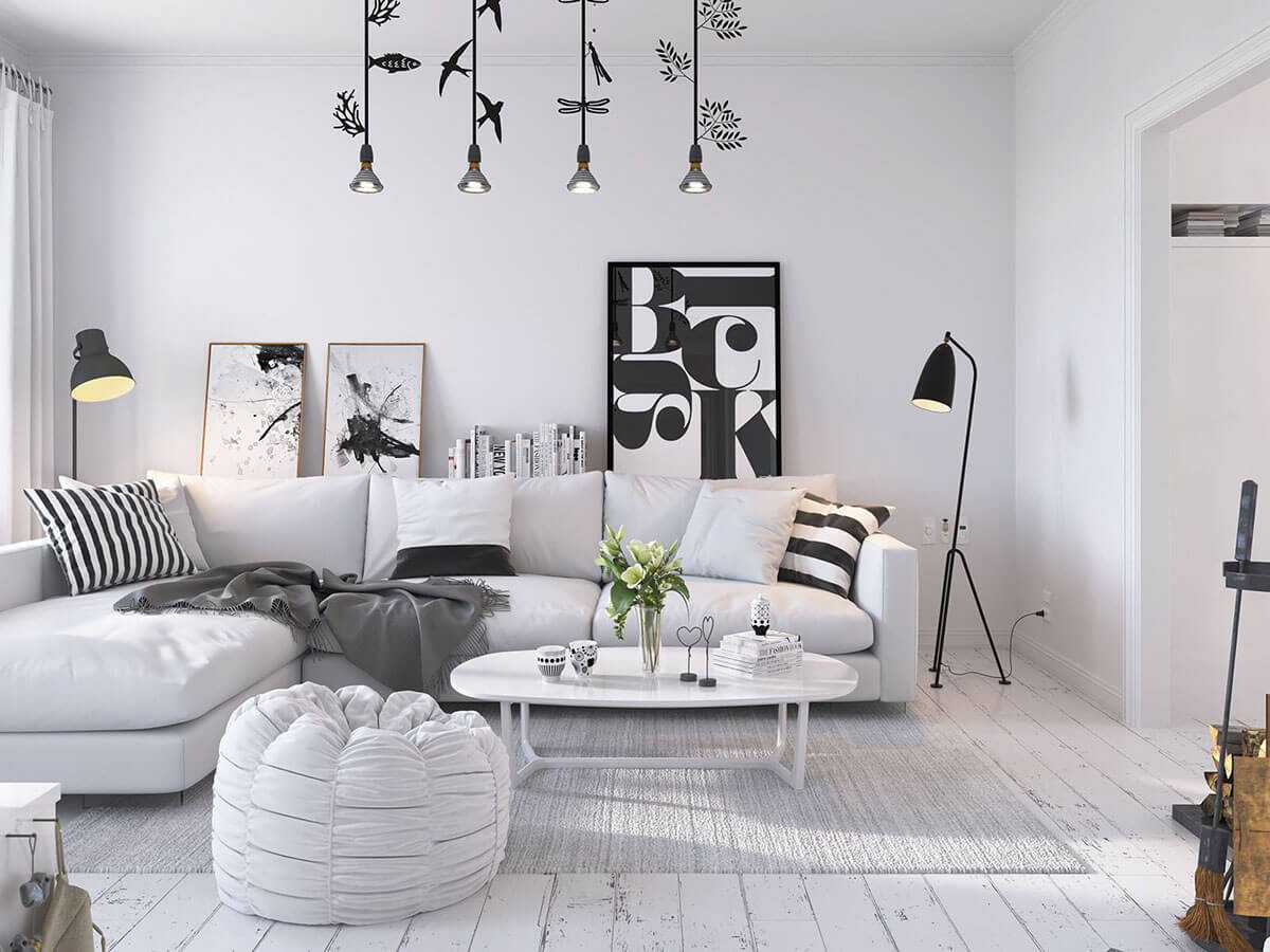 Монохромные интерьеры скандинавия-стиля нуждаются в дополнении аксессуарами.