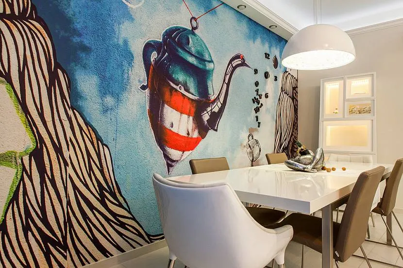Яркие элементы уличного искусства выгодно выделяются на фоне однотонного интерьера. Буйство красок в отделочных материалах, мебели и настенной росписи приведёт к созданию непонятного яркого пятна, вместо гармоничного дизайна.