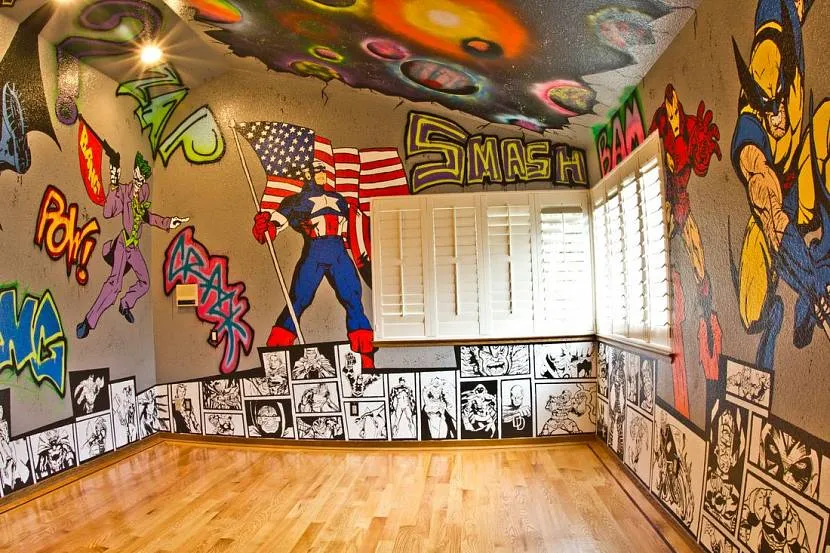 Поклонникам супергероев понравится роспись всех стен. Такие рисунки можно разглядывать часами. В данном случае комбинируются цветные чёрно-белые картинки, потолок также не оставили без внимания. Для фона стоит выбирать оттенки светлой цветовой гаммы, для того чтобы зрительно увеличить пространство.