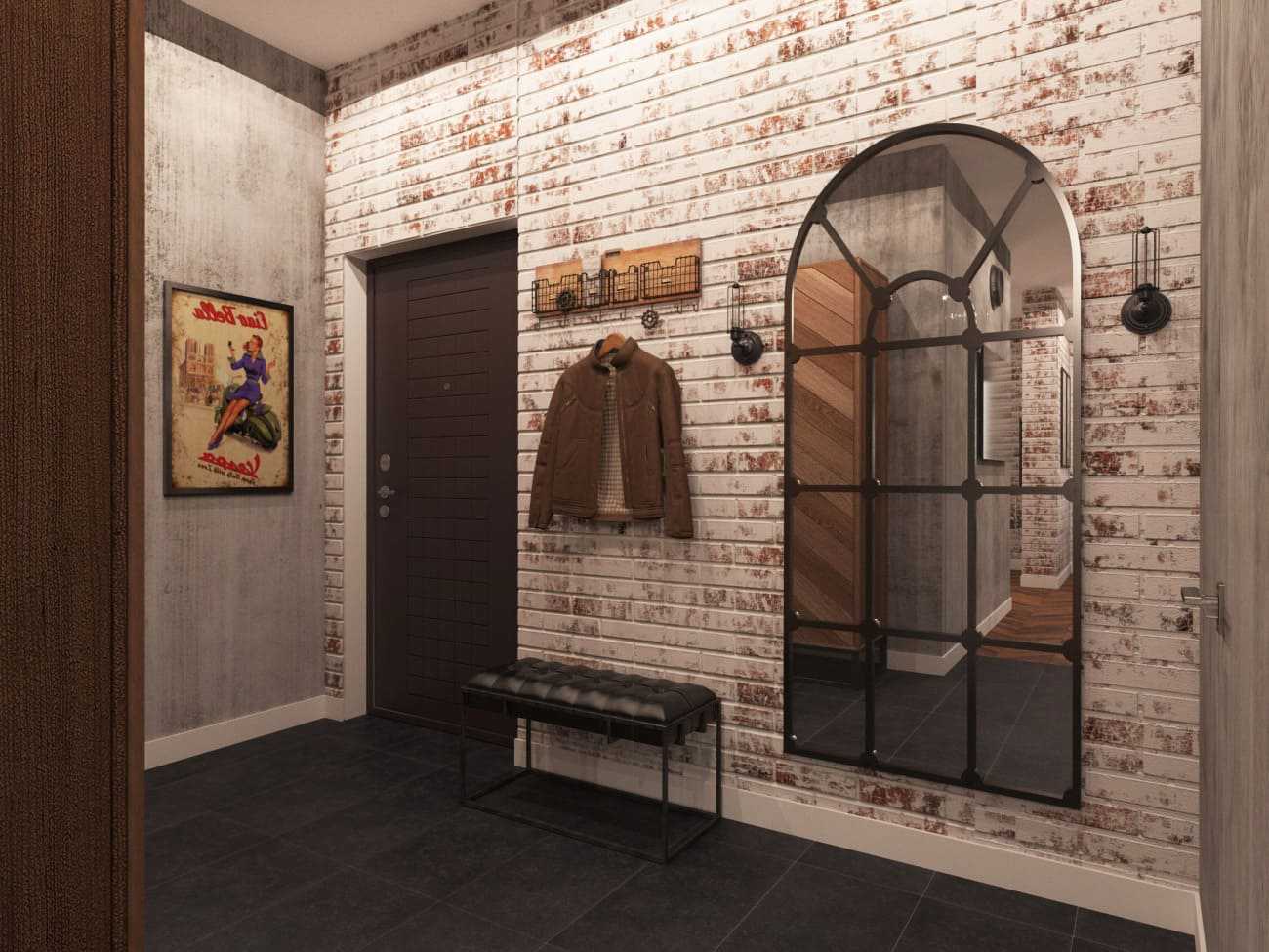 Стиль лофт в интерьере создан за счет меблировки и двух заметных деталей: напольного зеркала и железной вешалки для одежды. Пространство, прикрепленное к стене, увеличивает пространство. Шкафчик в холле вообще не требуется.