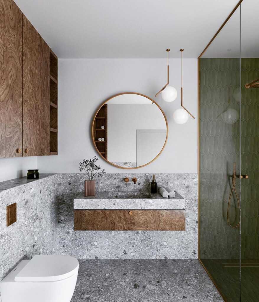 Хотя терраццо будет подходить везде, это самый популярный выбор для ванной комнаты. И все потому, что он просто создан для тех условий, которые в ней преобладают.