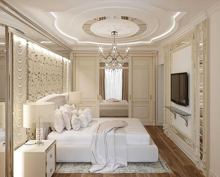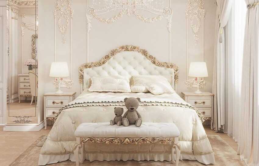 Классический дизайн бежевой спальни является роскошным и помпезным. Характерными чертами становится симметрия, античные нотки. Грамотно составленный интерьер напоминает королевский дворец.