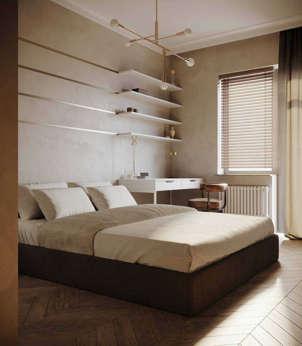 Спальня – место отдыха и расслабления, а этот оттенок один из тех, кто редко привлекается на себя излишнее внимание