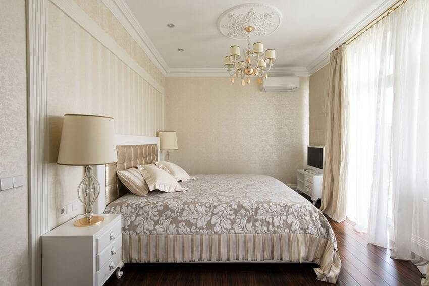 Отделка спальни бежевыми обоями с ярко выраженной фактурой