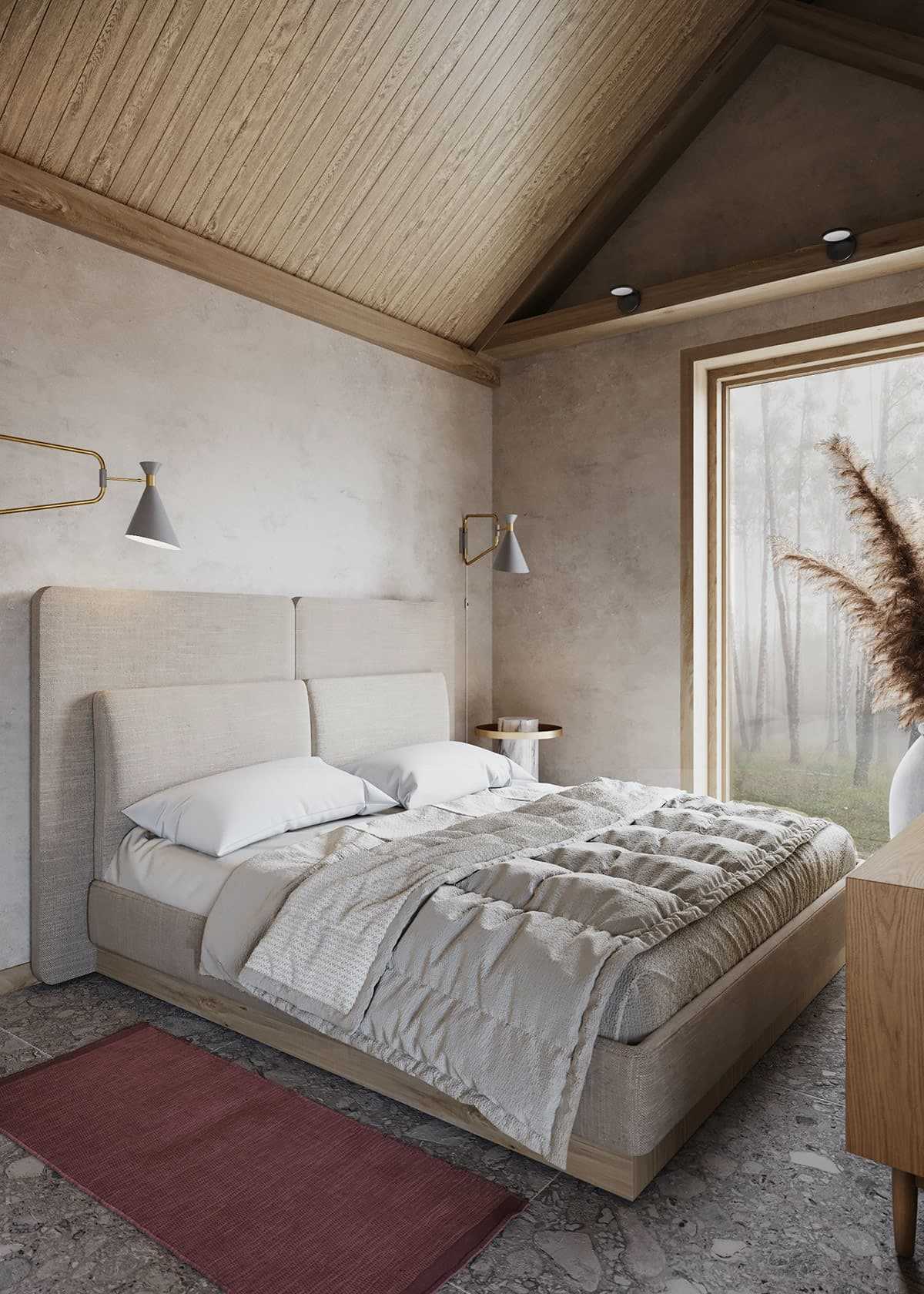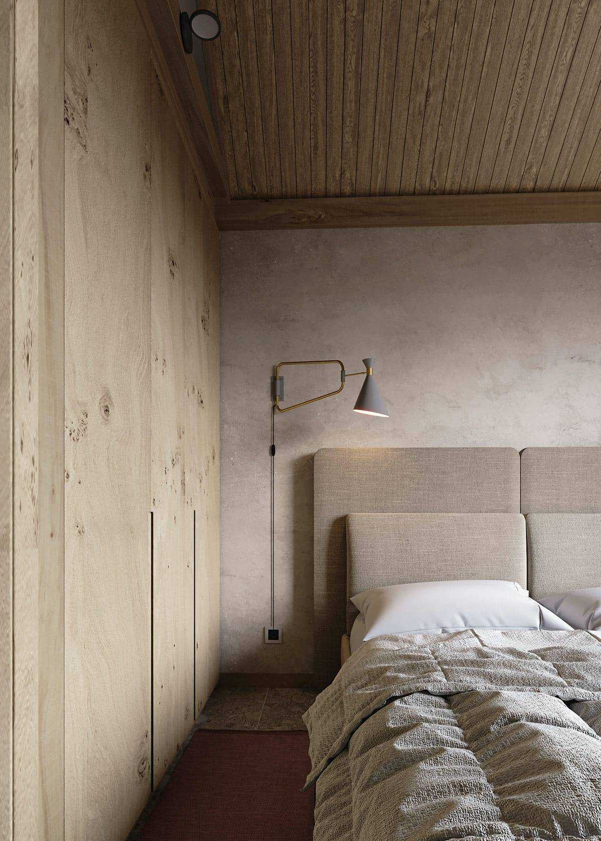 Иногда бежевый разбавляется серым, что позволяет создать контраст теплого и холодного оттенков, характерный для спальни в сканди-стиле.