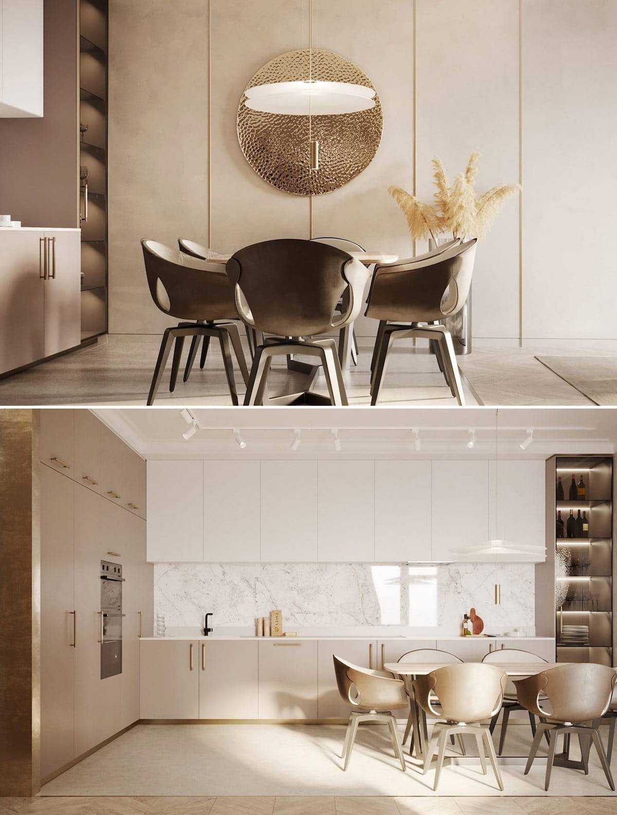 Одно из возможных решений – подбор стола и стульев в тон к столешнице. Это хороший вариант при дефиците пространства: интерьер не перегружается, а перекликающиеся цвета разных объектов добавляют впечатления продуманности. С бежевым хорошо сочетаются различные оттенки дерева.