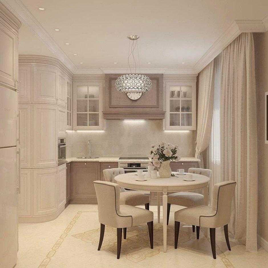 Классический стиль чаще всего оформляется с содержанием в интерьере бежевых деталей, поэтому в нем бежевая кухня является наиболее гармоничным решением. Помимо этого такой дизайн обязательно содержит элементы древесины, массивную мебель, тяжелые шторы, дорогую плитку.