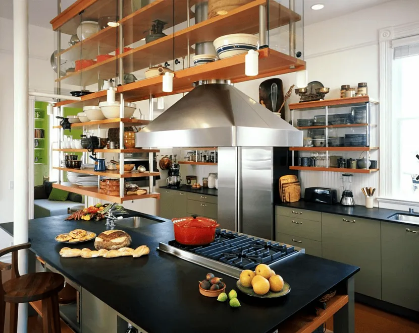 Нетрадиционное расположение — в обеденной зоне или зоне отдыха. В таких случаях выбирают вертикальные конструкции с полками разной конфигурации и материалов.