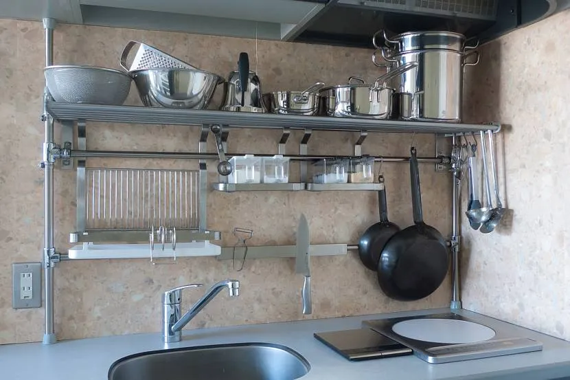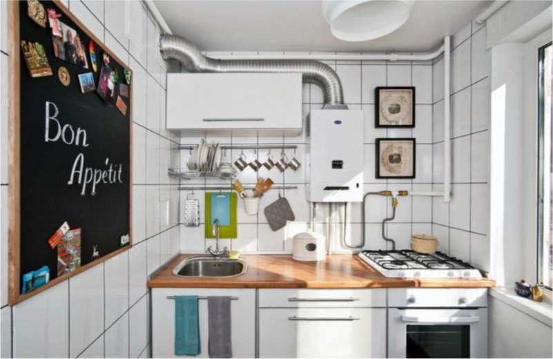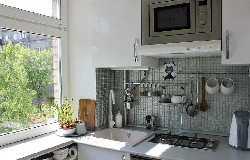 - В малогабаритных помещениях не рекомендуют вешать большое количество аксессуаров — это сделает пространство захламленным. Достаточно минимума предметов — например, приборы для готовки и несколько кружек.