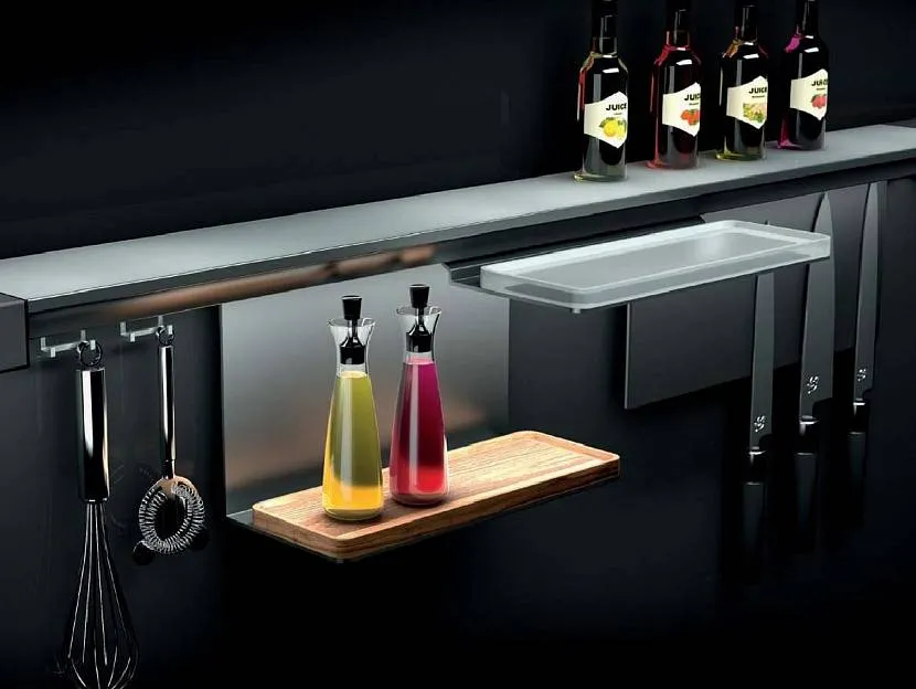 - В рабочей зоне хорошо размещают ножи, измельчители, доски. Отличный выбор – магнитная рейка для ножей.