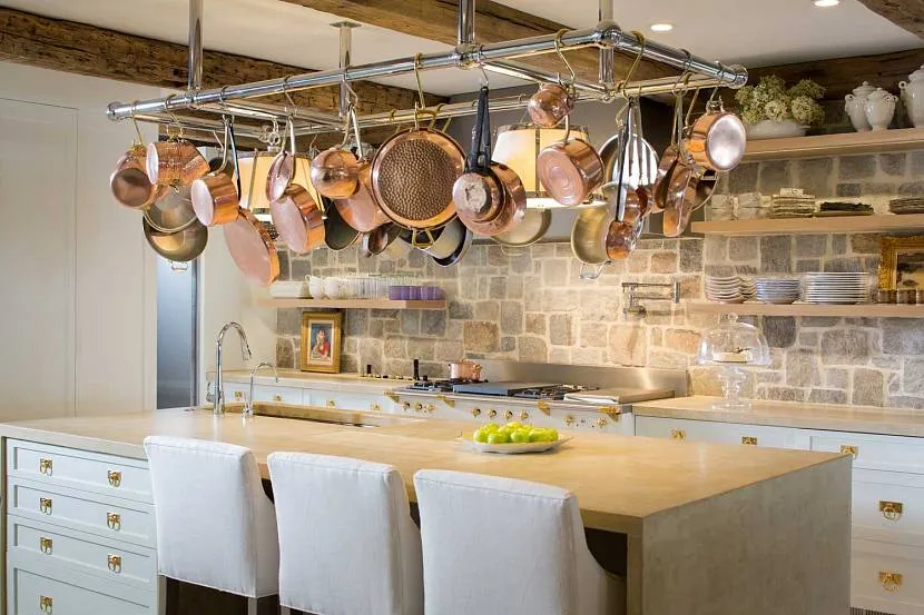 Еще эксперты советуют использовать лишь пару небольших конструкций, чем завешивать держателями всю площадь кухни. Это позволит избежать иллюзии хаоса, а интерьер не пострадает от перегруженности.