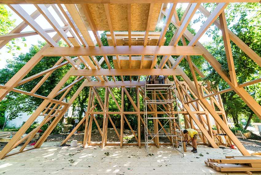 Крышу и остальные несущие элементы рекомендуется изготавливать из клееного бруса, причем материалом для выбора становятся хвойные породы. Горизонтальные балки и стойки – это и есть каркас стены. Раскосы, выполненные диагонально, формируют жесткость рам и служат дополнительной защитой в случае землетрясения. Для нижней обвязки дома чаще применяется брус, который крепится к фундаменту анкерными болтами. Основание дома (по немецкой технологии фахверк) отдельно покрывают гидроизоляционным слоем, для этой цели используют листы пенополистирола.