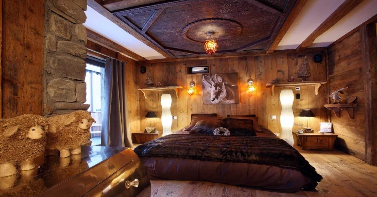Стены частично или целиком обшиваются деревом. Очень редко встречаются обои. Вертикали, диагонали и горизонтали из декоративных досок имитируют несущие конструкции, отделяют ниши, обрамляют окна и дверные проемы. Такое оформление может и отсутствовать. В этом случае мебель красуется на фоне гладко выкрашенных стен преимущественно светлых тонов.