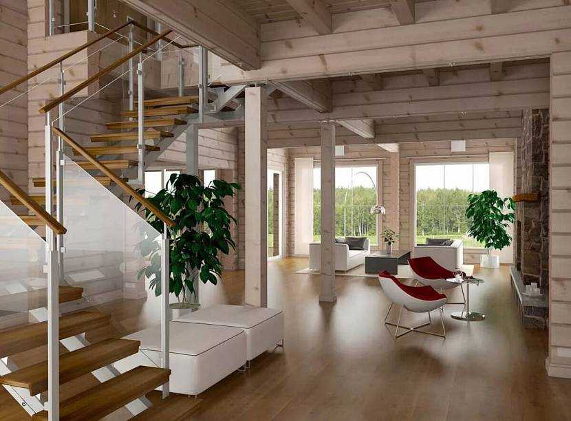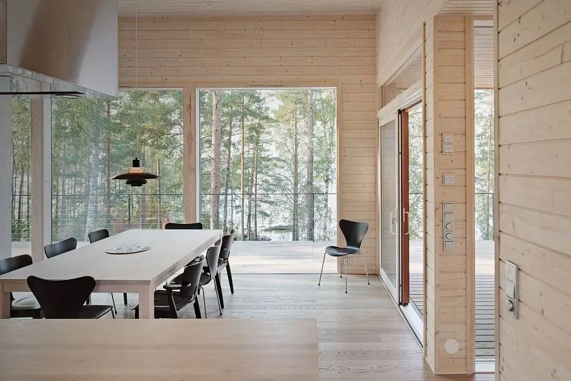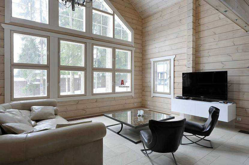 Финская модель считается наиболее простой, по сравнению с канадской. Чтобы построить такой дом, необходимо выбрать место, получить разрешение на строительство, подвести на участок все коммуникации. После возводится каркас, который обшивается профилированным брусом с двух сторон. Гидроизоляцию здания делают обязательно, в качестве утеплителя используют целлюлозную эковату. Полы здесь деревянные, а панорамные окна предполагают наличие двойных либо тройных стеклопакетов.