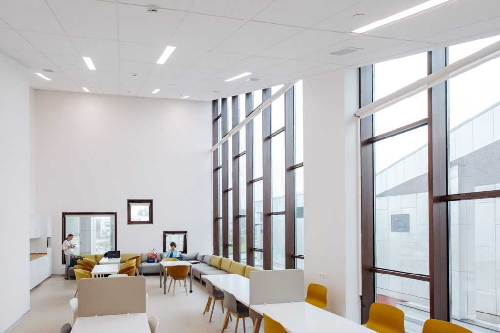 Благодаря большим панорамным окнам в помещении яркое естественное освещение. Ключевой элемент интерьера ― общие пространства, где дети могут учиться, работать индивидуально и в командах и просто комфортно проводить свободное время.
