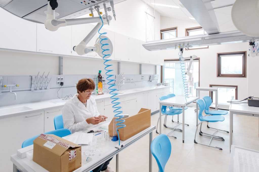 В школе также есть классы, предназначенные для конкретных уроков, они соответствующе оборудованы. В кабинете химии столы уже не двигаются, они закреплены и покрыты специальным веществом, которое не вступает в реакции с другими веществами, поэтому никто из учеников стол не прожжет. Над столами — вытяжки и системы для крепления проводов, чтобы случайно не сорвать их в порыве научного энтузиазма.