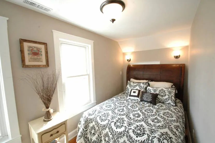 Обычно для спален с дефицитом свободной площади в декорировании ограничиваются. Допустим лишь незначительный акцент. Иначе пространство покажется перегруженным.
