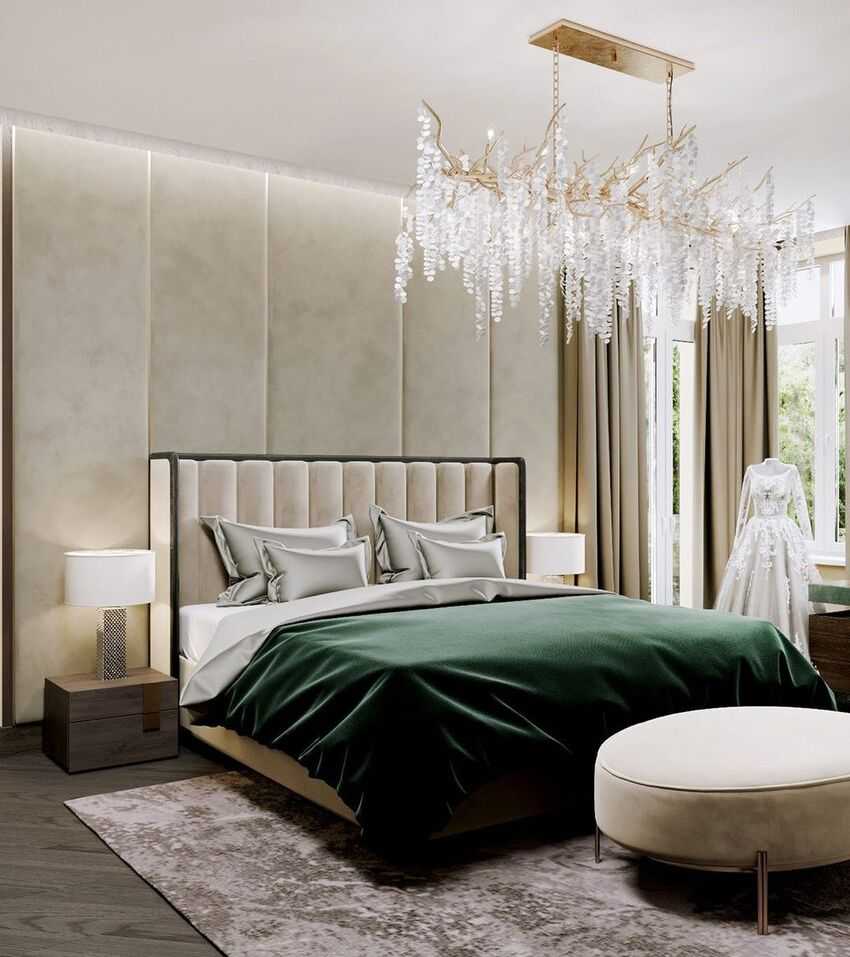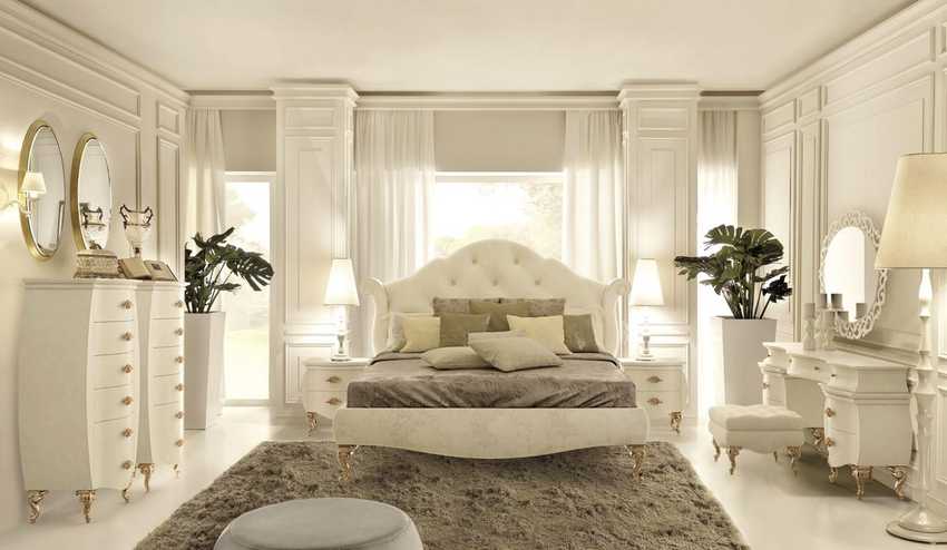 Эта комната обычно обставляется элегантной, комфортной мебелью высокого качества. Ключевой элемент помещения — кровать, поэтому главный акцент должен быть именно на ней. Идеально, если спальное место будет изготовлено из дорогого дерева. Оно должно быть квадратной формы, может быть украшено резьбой. Изголовье обычно обтягивается бархатом, шелком или натуральной кожей.