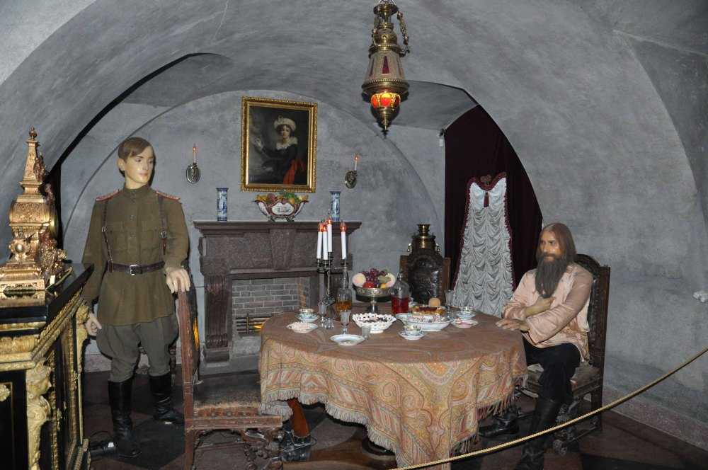 Туристы спускаются в подвал, где был убит фаворит императора. В тесном помещении с низкими сводами они видят восковые фигуры. Сидящий за столом с отравленным угощением Григорий Распутин и его убийца Феликс Юсупов создают эффект присутствия. Кажется, вот-вот Юсупов выстрелит в Распутина.