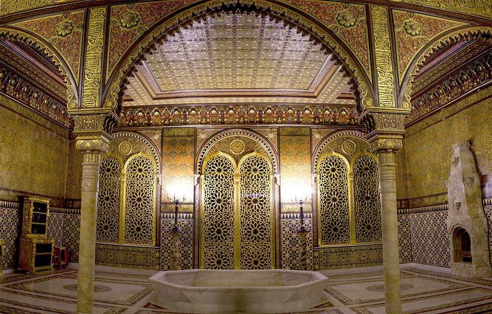 - Мавританская гостиная –97 кв. м. Поражает колоритом и роскошью: стены затянуты тисненой кожей, в центре зала бил фонтан, вдоль стен – диваны и золотом выведенные строки из Корана. В углах комнаты – изящные скульптуры.