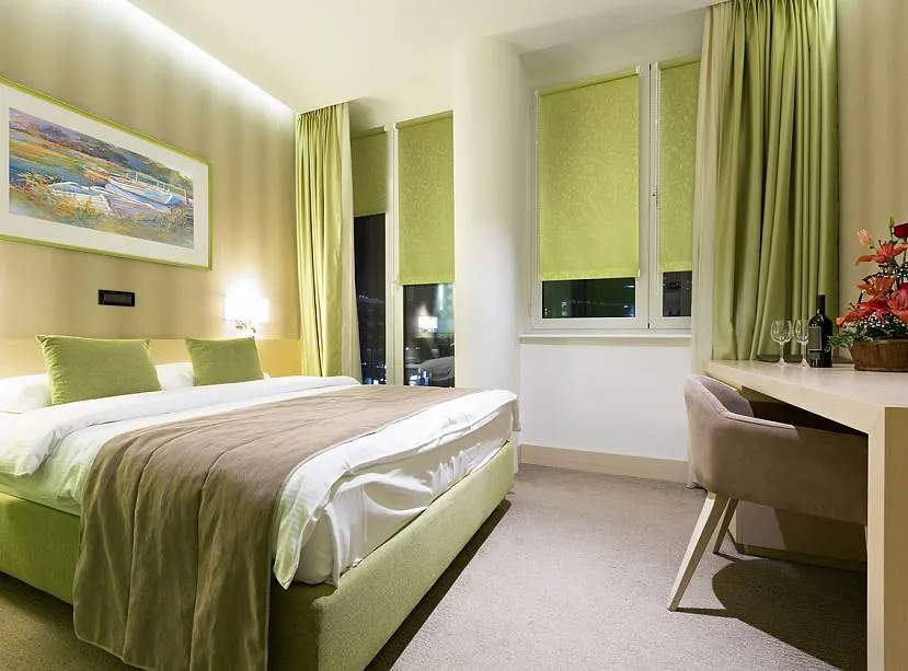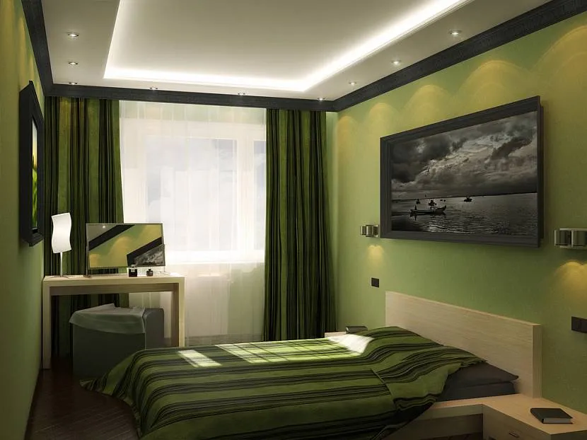 Узкая спальня с салатовыми стенами и зеленым декором на кроватиИсточник dizainexpert.ru