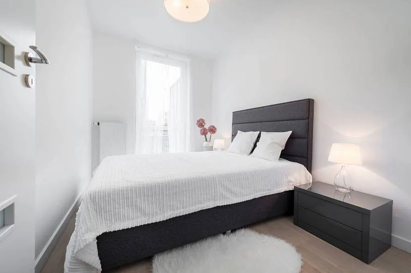 Узкая спальня с преобладающим белым и черным акцентомИсточник remontbp.com