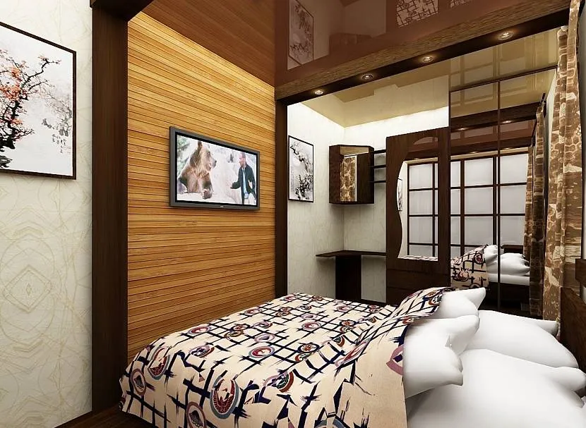 Отделка деревом стен в узкой спальнеИсточник bucwar.ru