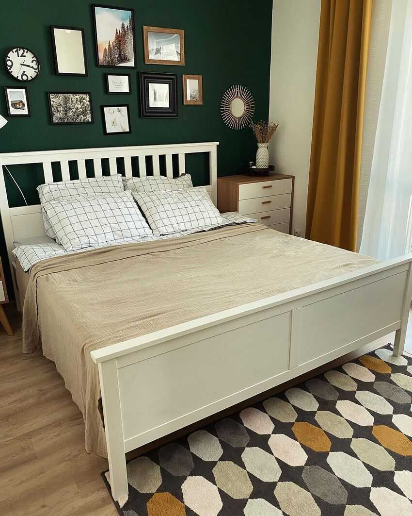 Вы думаете, что темно-зеленые стены не будут соответствовать вашей спальне, но вы хотите использовать этот цвет в качестве акцента? Перекрасьте старую мебель — это экономичное и экологичное решение. Вы также можете заменить ручки, например, на золото. Благодаря этому зеленый в спальне не будет преобладать, а вы успокоите его серым.