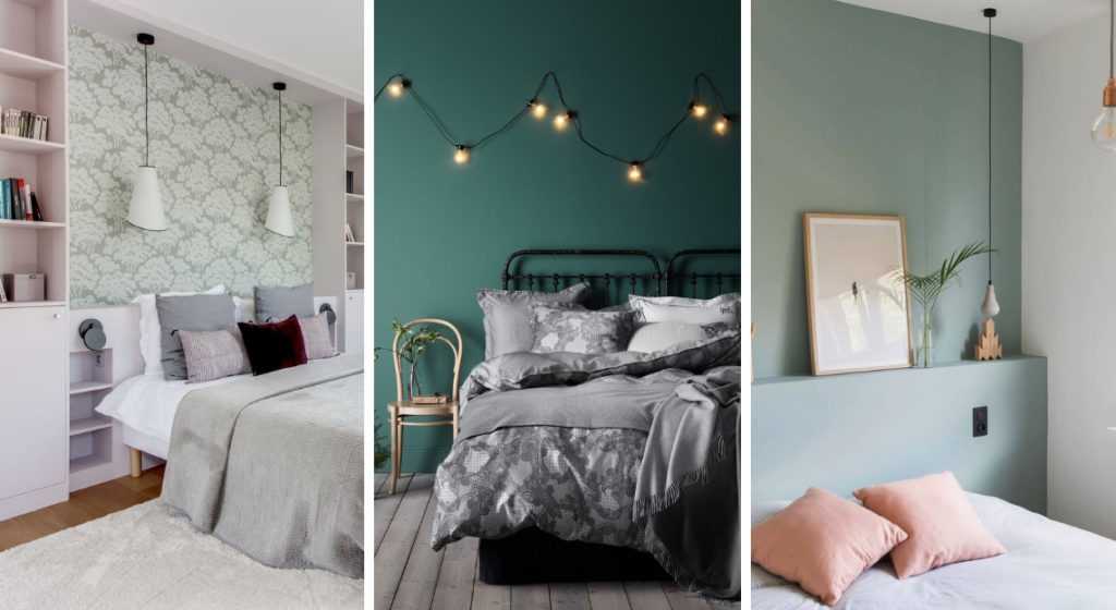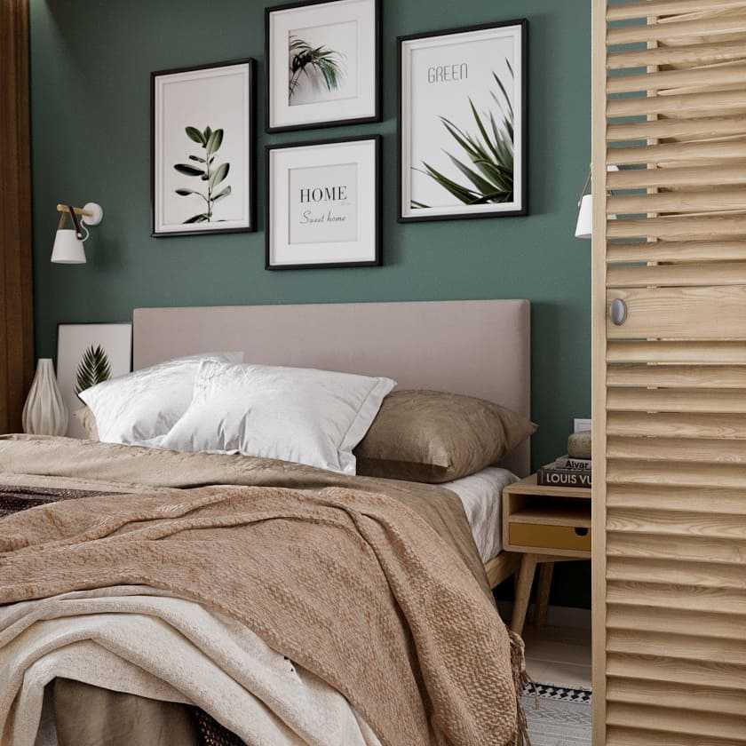 На фоне стены с интересными обоями отлично подойдет кровать с обитым темно-зеленым изголовьем. Благодаря этому вы дополнительно подчеркнете ведущий цвет интерьера, а также защитите стену от грязи. Если за кроватью однотонная темно-зеленая стена, выберите деревянное изголовье, соответствующее цветам других элементов оборудования. Если вы мечтаете о серо-зеленой спальне, серое изголовье будет идеальным.