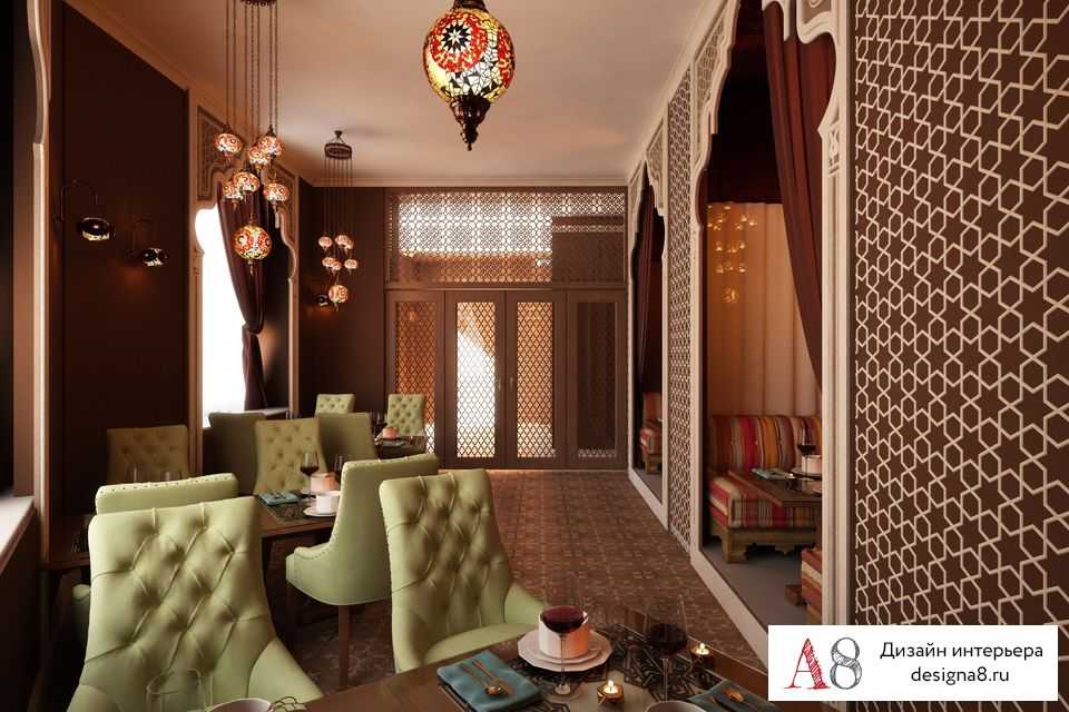 Вдоль противоположной стены устроены ложи с диванами, имеющие обособленную структуру. Ложи разделены между собой занавесками из светло-бежевых тканей, которые отлично сочетаются с фоновыми стенками, оформленными под персидский ковер, и бордовыми шторами и поверхностями. Особенно оригинально смотрятся фигурные арочные проходы в сочетании с резным узором перегородок.